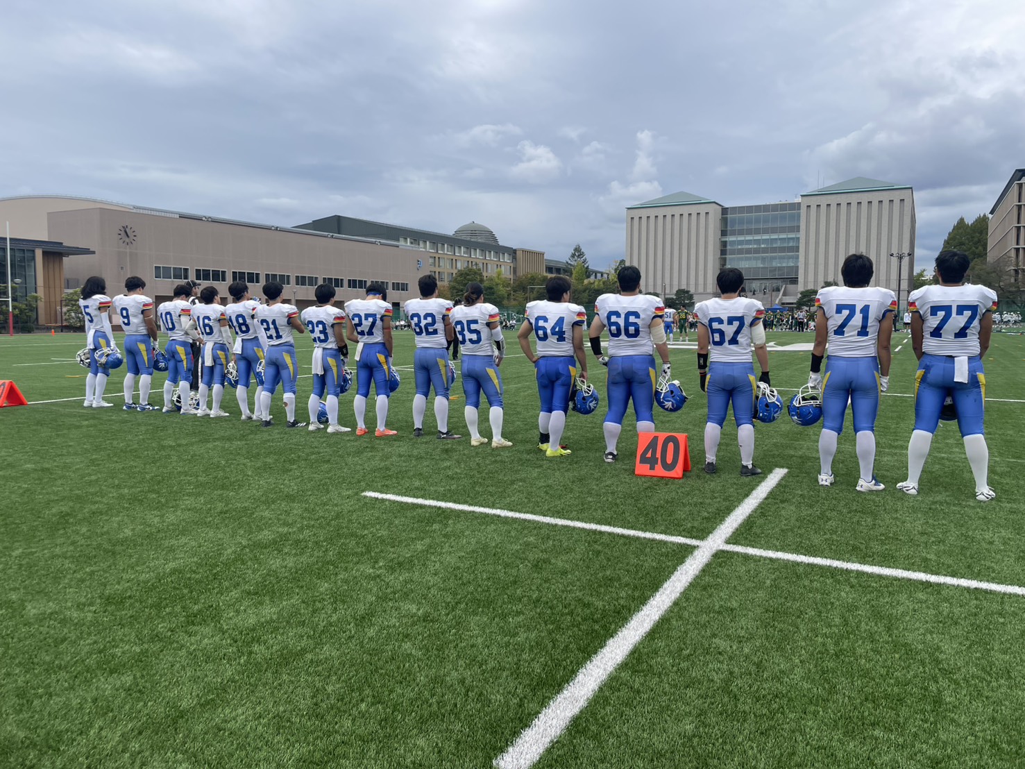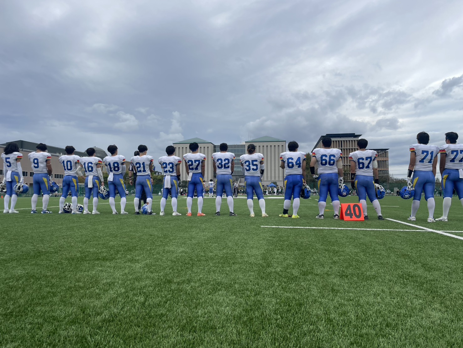 まずは、私自身のLB(ラインバッカー)への挑戦について少し触れさせていただきます。私は163cm・62kgと小柄ながら、今年からLBへの挑戦を志願しました。春学期はアライメントやラインの伸びに苦戦し、悔しさを抱える日もありましたが、練習前後にブロッカー処理やタックルを繰り返し、フィジカルトレーニングを積み重ねることで、少しずつ成長を実感できる瞬間が増えていきました。失敗から学ぶ面白さに改めて気づき、今はアメフトが本当に楽しいと感じています。これからも基礎と課題に向き合い続け、成長していきたいと思います。