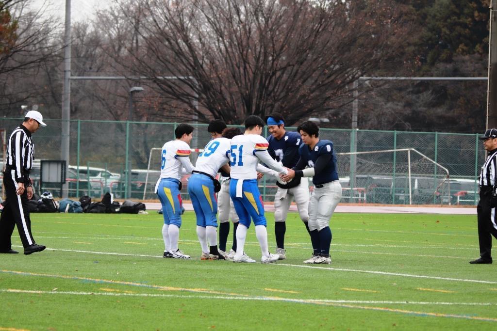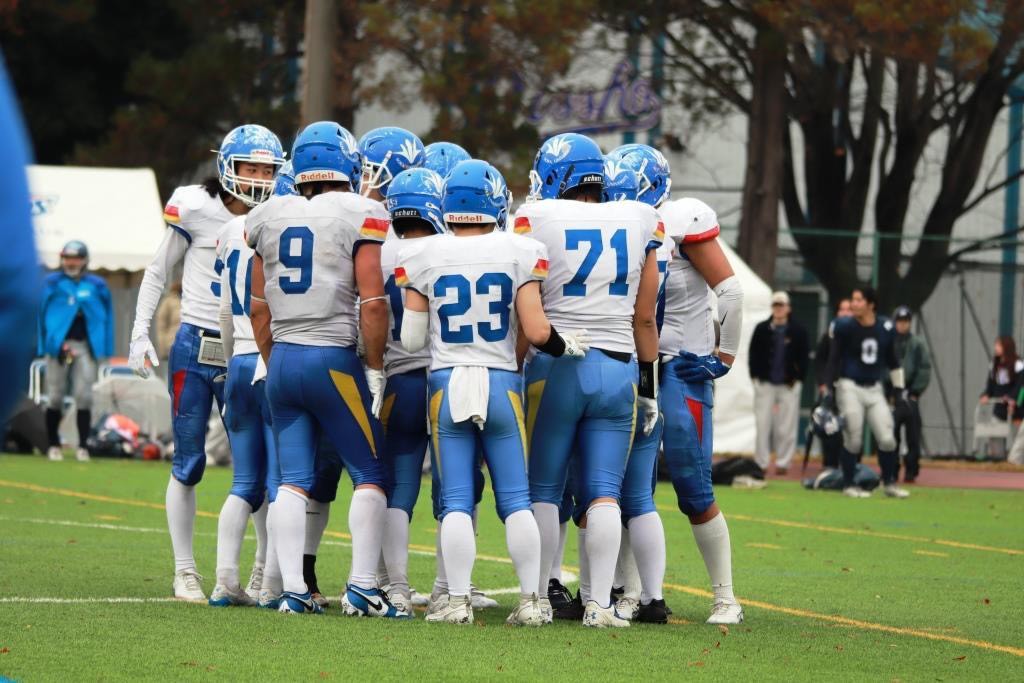 迎えた後半3Q。ランプレーで大きく進み、21番 藤本大翔が見事TD!その後のTFPも成功し、7-0とリードします。しかし、4Qで立正にTDを許すものの、追加点は与えず7-6に抑えたまま、試合は終了となりました。